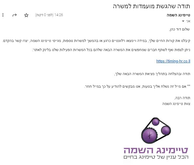 הודעת המייל תהיה עם ניסוח אישי שלנו, ותכלול את שם המועמד ופרמטרים נוספים שנחליט שיהיו בתוכן המייל.